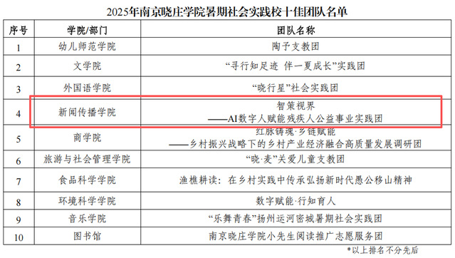 近日,新闻传播学院“智策视界”AI数字人赋能残疾人公益事业实践团在我校2025年暑期社会实践评选中脱颖而出,荣获校级暑期社会实践“十佳团队”称号。该团队以科技助残为切入点,深入基层开展政策宣传、技术培训与志愿服务,探索出一条“高校+残联+社区”三方联动的公益服务新路径,展现出新时代青年学子的责任担当与创新活力。