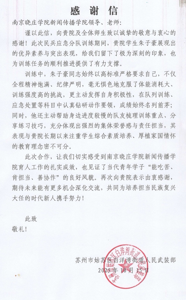 10月20日,新闻传播学院收到苏州市姑苏区白洋湾街道人民武装部发来的感谢信。信中不仅高度赞扬学生朱子豪在民兵应急分队训练中的突出表现,更对学院“五育并举”的育人理念与卓越的人才培养成效致以诚挚感谢,为学院“实践育人”成果再添生动注脚。