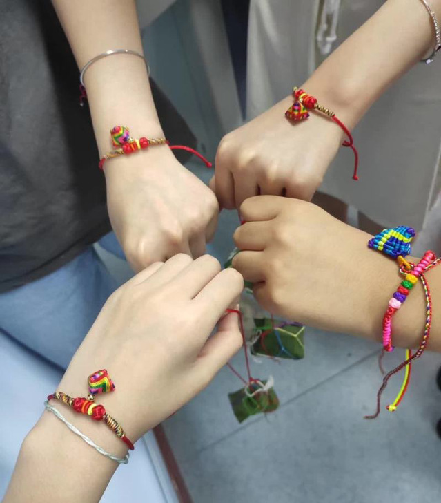 学院领导对参与活动的师生代表表示欢迎和感谢,女子学堂负责人介绍了活动内容及疫情防控的有关注意事项。随后,师生们分享交流了端午节系五彩绳习俗的起源及寓意。据悉,中国古代尚五色(青、赤、黄、白、黑),常以五色为吉祥色,各地亦多有端午节缠五色线的风俗习惯。《荆楚岁时记》中载:“以五彩丝系臂,名曰辟兵,令人不病瘟。”长期以来,端午节编、系五彩绳寄托了人们对幸福健康的美好愿望。