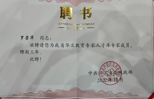 为深入贯彻落实中央和江苏省委有关华文教育工作文件精神,进一步提高全省海外华文教育工作水平, 加强华文教育人才队伍建设,江苏省委统战部在全省范围内积极推动华文教育专家人才库建设 。3月22日,南京市委统战部举行“悦读南京 走近红学”文化交流活动。经过推荐和层层选拔,新闻传播学院院长罗荣华教授被聘为江苏省华文教育专家库成员。