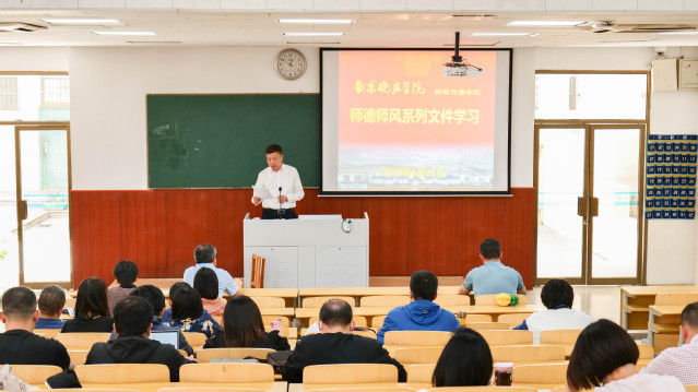 陈长伟带领全体老师领学习习近平总书记关于教育的重要论述、《关于全面深化新时代教师队伍建设改革的意见》、《新时代高校教师职业行为十项准则》等学习材料,并就具体案例进行了阐述和警醒。