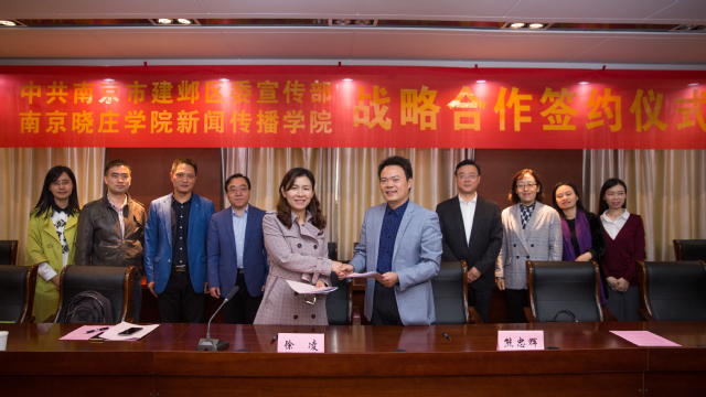 建邺区委宣传部副部长、区文明办主任徐凌,学校宣传部副部长祝中华,新闻传播学院教师和学生代表参加了签约仪式。